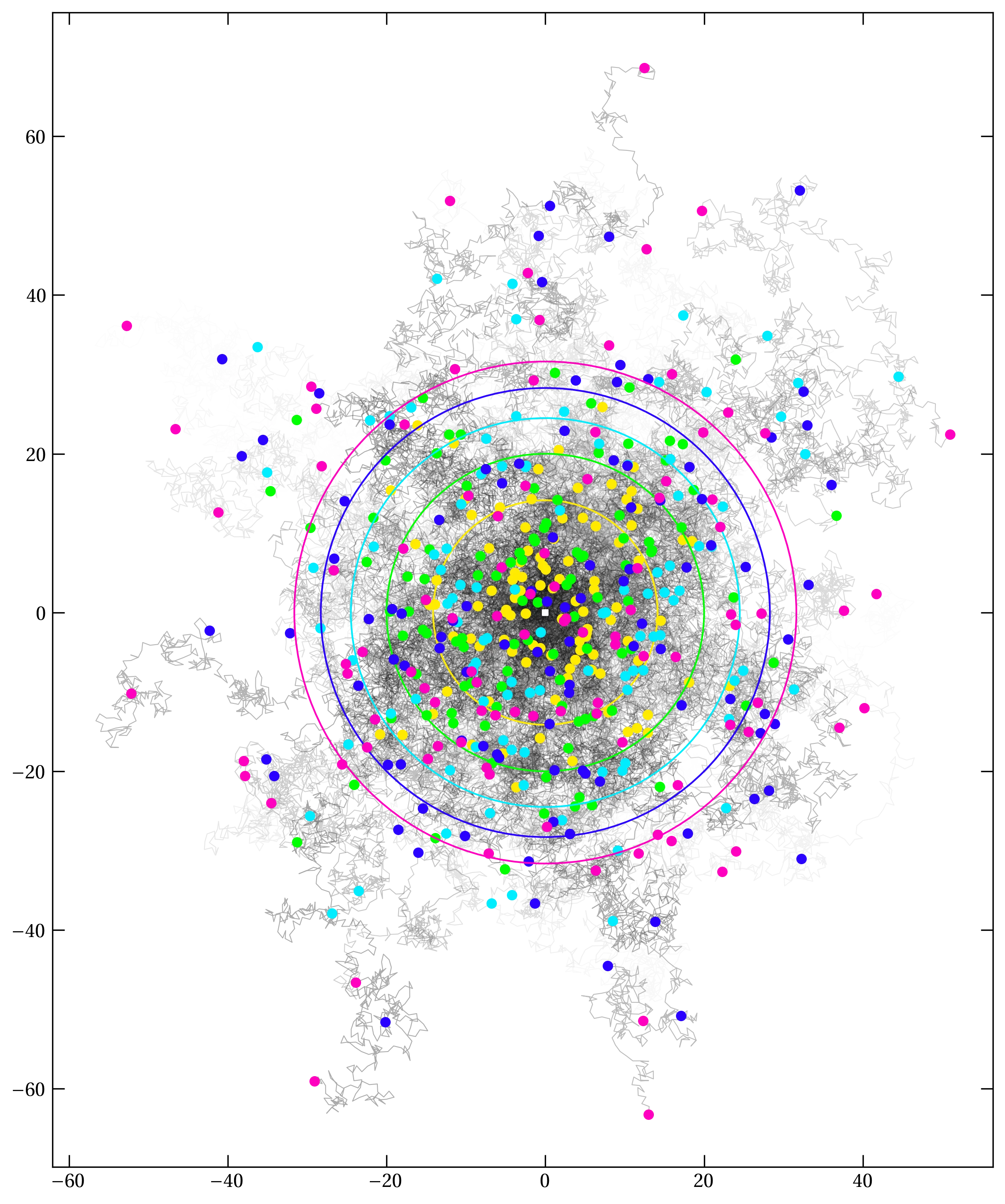 Figure 1 — A collection of two-dimensional random walks, starting from the origin (shown with a white square), each taking \(N=1000\) steps of unit length. The colored circles mark the expected value of \(\sqrt{\ev{r^2}} = \sqrt{n}\) after 200, 400, 600, 800, and 1000 steps. The colored dots make the corresponding position on each walk.